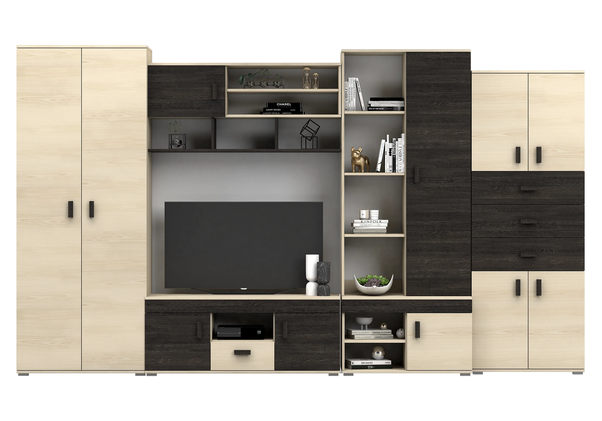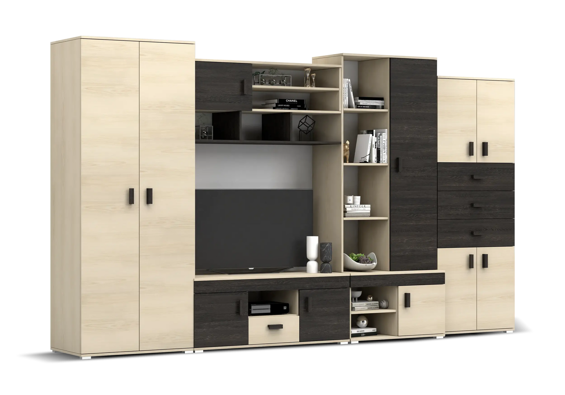 Dviejų durų spinta su drabužių kabykla ir lentyna viršuje: Plotis 80 cm / Aukštis 202 cm / Gylis 52 cm TV staliukas: Plotis 120 cm / Aukštis 47 cm / Gylis 52 Antstatas lentyna virš TV staliuko: Plotis 120 cm / Aukštis 55 cm / Gylis 42 Spintelė apatinė su durelėmis ir niša + viršutinė su atviromis lentynomis ir durelėmis, už kurių 3 lentynos: Plotis 80 cm / Aukštis 200 cm / Gylis 52 cm Spinta su 3 stalčiais ir 4 durelėmis, už durelių po 1 lentyną: Plotis 70 cm / Aukštis 187 cm / Gylis 42 |